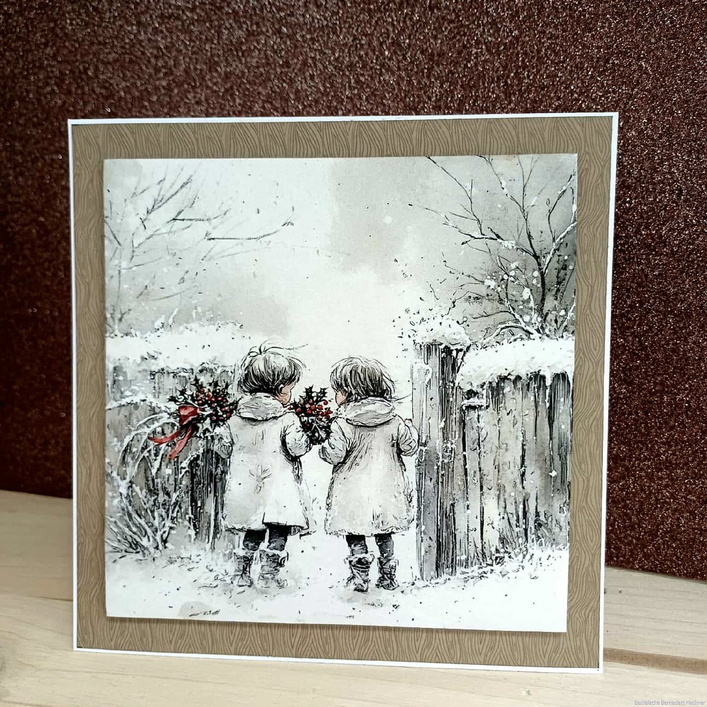 Weihnachtskarte "2 Kinder beim Zaun" Grundkarte in 15,2x15,2cm. Weiß, glatt. Das Motiv wurde auf einen "Kartenaufleger" transferiert und so mittels Abstandpads auf die Grundkarte geklebt. Karte wird mit Kuvert und in einer Schutzhülle geliefert Aktion war erfolgreich Das hat leider nicht geklappt. Warenkorb anzeigen Zur Kasse gehen Weiter einkaufen 4,95 EUR incl. 0% USt. zzgl. Versand Anzahl: St In den Warenkorb Auf den Merkzettel Weihnachtskarte "Weihnachtsbaum - Teddybär" Weihnachtskarte "Teddybär - Kamin"