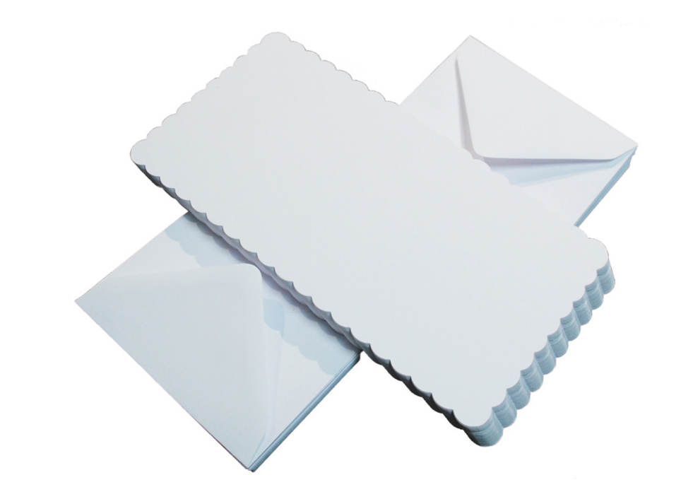 15x15cm - 50 Stk Blanko Karten in scalloped glatt weiß + 50 Stk passende Kuverts. 300gr - Karten, 100gr - Kuverts. Fa. CUK.