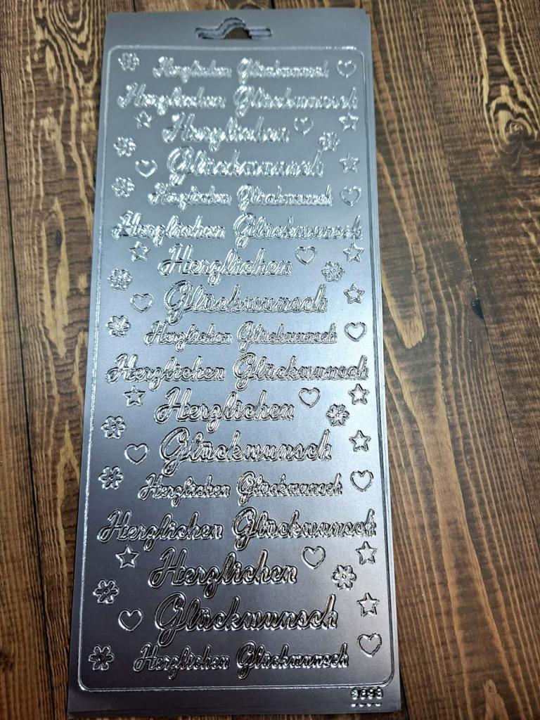 Stickerbogen "Herzlichen Glückwunsch" silber, metallic. Sehr gute Haftkraft. Auch auf Wachs.