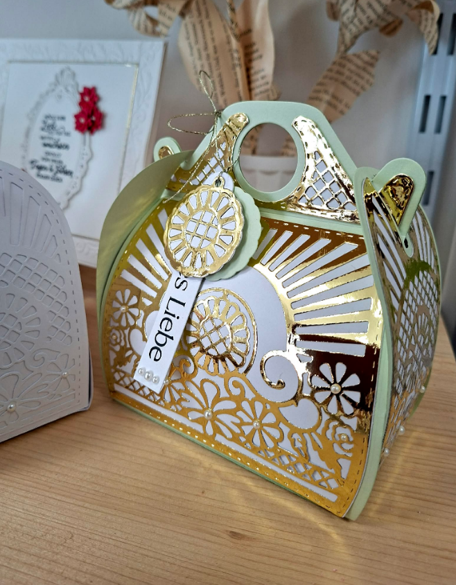 Geschenksbox zur Hochzeit, hellgrün,weiß,gold, Bastelecke