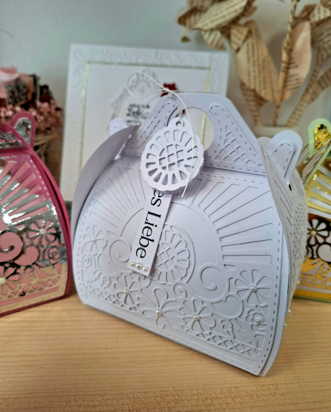 Handgefertigte Geschenke Box in weiß. Aufwendige Verarbeitung, mit Stauraum für Geld.-oder Kleingeschenke. Handmade by Bastelecke.