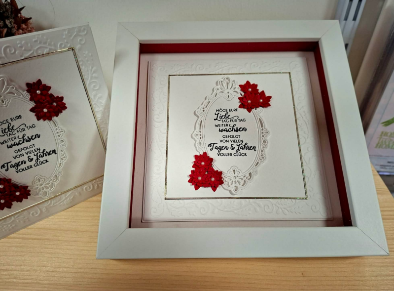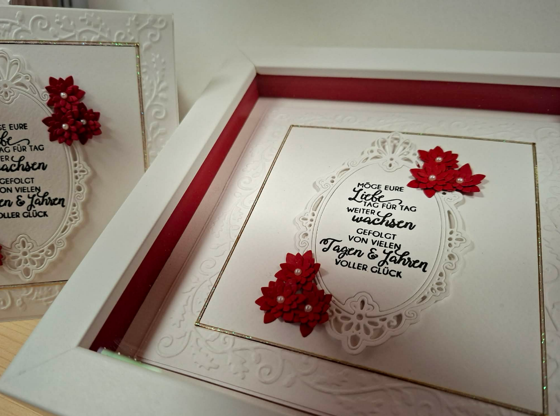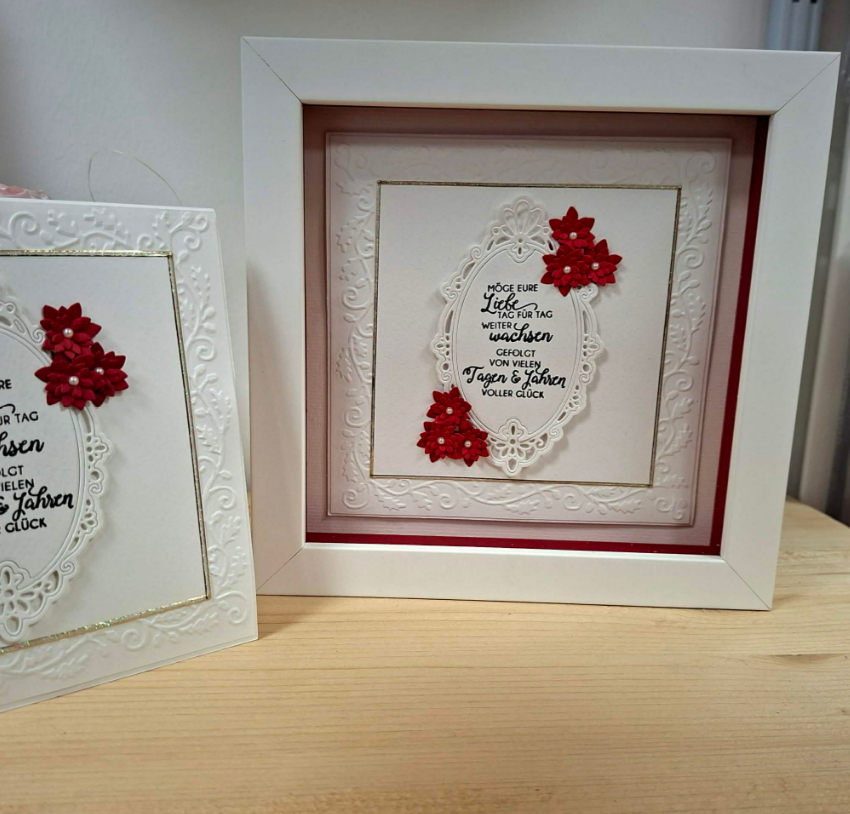 Sowohl die Karte als auch der Bilderrahmen sind handgefertigt. Größe der Karte 15x15cm. Hochwertige Verarbeitung des Rahmens mit innen rotem Passepartout. Glas ist UV beständig und entspiegelt.