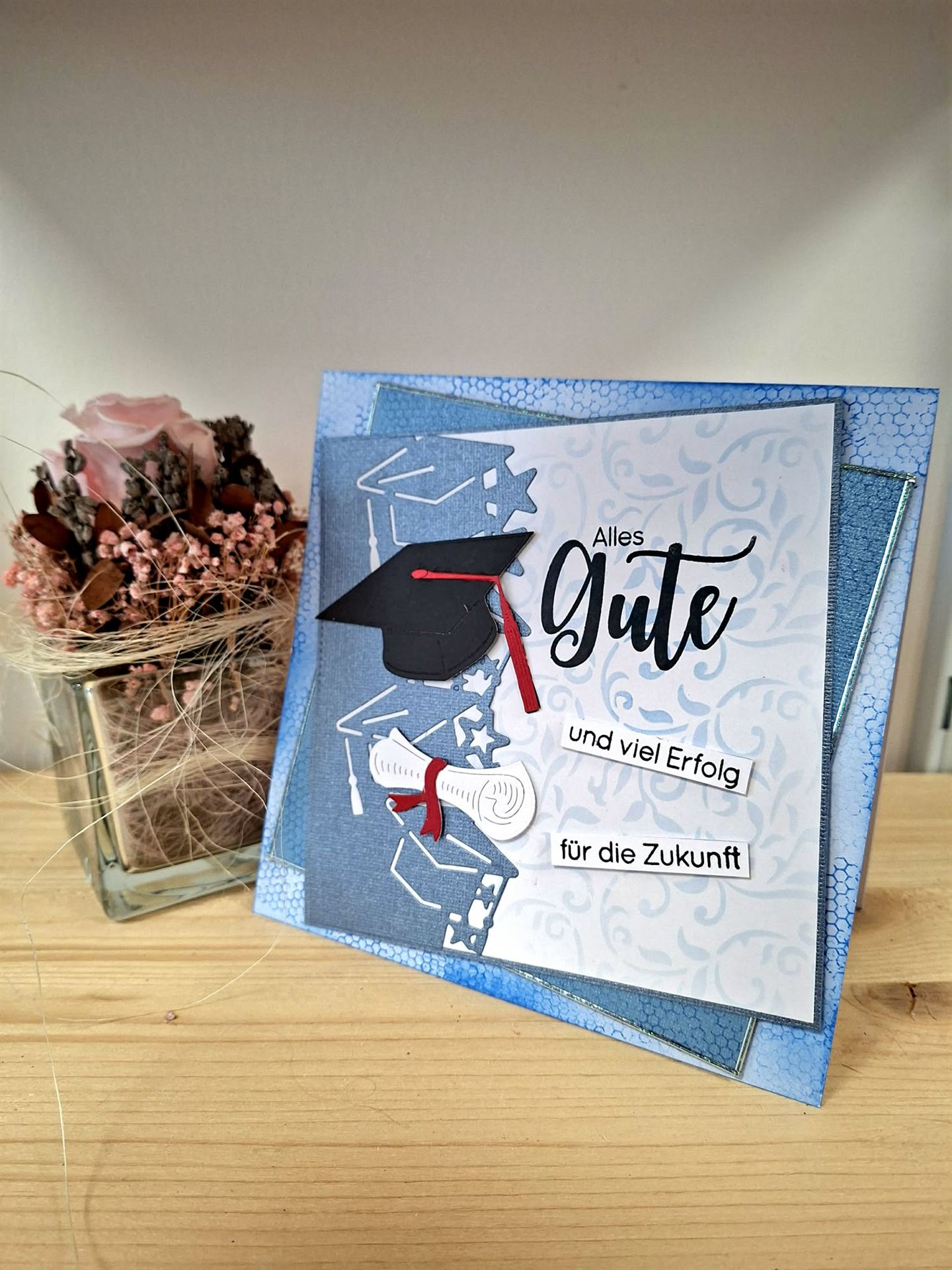 Glückwunschkarte zum Abschluß eines Studiums - gefertigt in blau. Größe ~ 17,5x17,5cm. Weiße Grundkarte mit färbigen "Aufleger" in blau. Aufwendig handgefertigt. Die Karte wird mit einem passenden Kuvert und in Schutzfolie, geliefert.